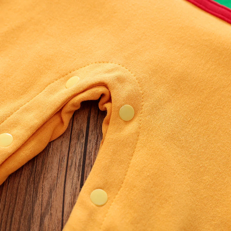 Dress your little one in bold, playful comfort with the Little Hero Bodysuit. Made from soft, breathable cotton, this vibrant long-sleeve romper brings fun character-inspired style to autumn days. The striking green, orange, and red patchwork design is topped with a printed chest symbol for an adventurous flair. Snaps along the legs make diaper changes easy, while the pullover neckline keeps dressing simple. Designed for baby boys aged 0–18 months, it’s perfect for everyday play or dress-up fun with a streetwear twist.